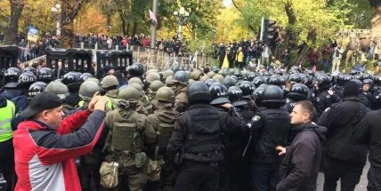 Группа участников созванного экс-президентом Грузии, лидером партии "Рух новых сил" Михаилом Саакашвили вече на площади Конституции у здания Верховной Рады покинула акцию с целью доставить аудиоаппаратуру для мероприятия, которую, как они утверждают, заблокировали правоохранители, после чего у грузовика началось силовое противостояние.