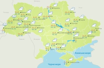Температура ночью -13-18°, в Черниговской и Сумской областях до -21°, днем -8-13°. В южной части и на Закарпатье ночью -6-11°, днем -2-7°; в Карпатах ночью -18-23°, днем -13-18°.