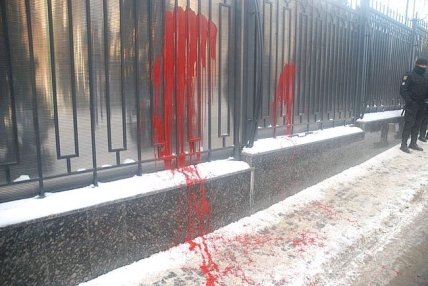 Среди требований пикета было прекращение российской агрессии, освобождение всех заложников, захваченных территорий и наказания виновных в агрессии. Во время акции ее участники зажгли файеры синего и желтого цветов и облили забор дипломатического учреждения красной краской, которая, по задумке организаторов, символизирует кровь.