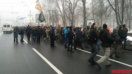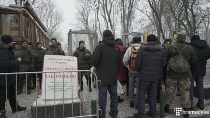 Среди митингующих – представители ветеранских организаций в камуфляжной форме, а также националисты с государственными флагами Украины.
