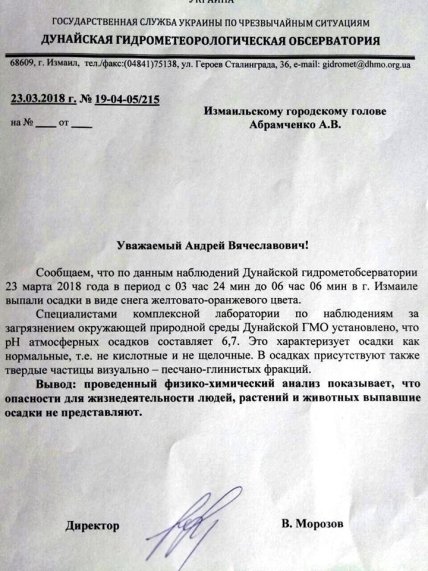 "Учитывая то, что в Измаиле выпал снег желтого цвета, сообщаю, что его образцы были направлены в Дунайскую гидрометобсерваторию и Одесский лабораторный центр Государственной службы Украины по вопросам безопасности продуктов питания и защиты потребителей с просьбой провести лабораторные исследования. Специалисты гидрометобсерватории считают, что кислотность представленных образцов снега нейтральная, в осадке - песчано-коричневая смесь. Вредные химические вещества не обнаружены. Выводы Одесского лабораторного центра Государственной службы Украины по вопросам безопасности продуктов питания и защиты потребителей будут позже. Машина с образцами снега выехала в Одессу", - отметил Авраменко.