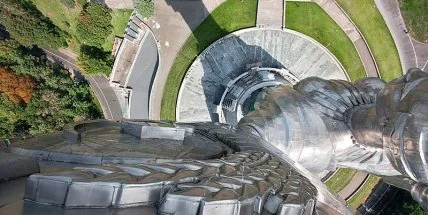 В середине монумента функционируют два лифта. Первый имеет 9 остановок и поднимается снизу до самой макушки. Второй лифт передвигается под наклоном 75 градусов. Чтобы добраться на смотровую площадку надо подняться одним лифтом на высоту 32 метра, затем вторым на 72 метра. После чего идет лестница к самому щиту. На лестнице посетителям одевают страховку. Сама смотровая площадка построена в форме клетки, закрытый со всех сторон. На экскурсию пускают лиц старше 18 лет. За раз подъем могут осуществить два человека вместе с инструктором. Стоимость - 300 грн. Продолжительность визита на монумент примерно 45 мин.