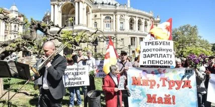 Несколько десятков пророссийских активистов, в основном, пожилые люди и пенсионеры, провели приуроченный к 1 мая митинг у Оперного театра в Одессе.
