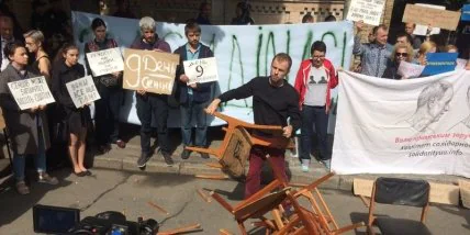 У администрации президента Украины в Киеве проходит акция "Досить сидіти!" (рус. "Хватит сидеть!"), организованная сообществом "Свободу "крымским заложникам" - Сенцову и Кольченко", с призывом к украинским властям активизировать действия по освобождению политических заключенных украинцев в России.