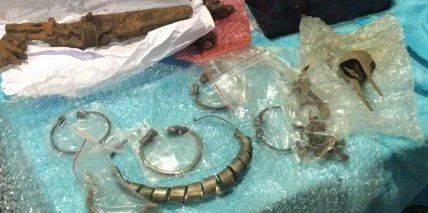 Во время досмотра вещей дельца сотрудники СБУ обнаружили скрытые от таможенного контроля уникальные ювелирные украшения и элементы старинного оружия. "По заключению экспертов, возраст некоторых обнаруженных предметов составляет более полутора тысяч лет", - сообщили в пресс-центре.