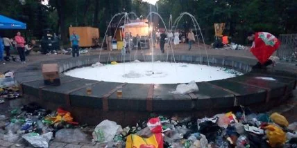 В парке Шевченко, где обустроили фан-зону болельщиков "Ливерпуля", отдыхающие забросали мусором фонтан.