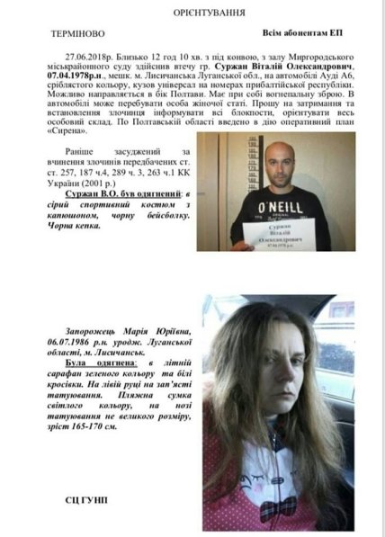 Напомним, из зала Миргородского районного суда Полтавской сбежал преступник. Мужчина осужден за совершение преступлений, предусмотренных ст. 257 (бандитизм), 187 (разбой), 289 (незаконное завладение транспортным средством), 263 (незаконное обращение с оружием) УК Украины. Впоследствии полиция обнаружила брошенное транспортное средство, на котором передвигался осужденный вместе с женщиной.