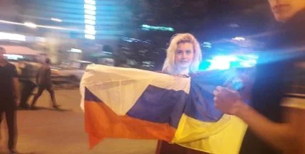В центре Киева молодые люди фотографировались с российским триколором и украинским флагом.