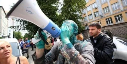 Перед акцией злоумышленники облили Шабунина зеленкой, а также бросили в него несколько тортов в упаковках торговой марки «Рошен».