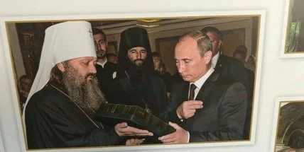 На проходящей на территории Киево-Печерской лавры выставке появилось фото президента России Владимира Путина.