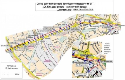 Автобусы маршрута № 3Т "Ст. Кольцевая дорога – железнодорожный вокзал "Центральный" будут курсировать по маршруту: ул. Леся Курбаса – просп. Космонавта Комарова – ул. Борщаговская – ул. Жилянская – ул. С. Петлюры – Вокзальная площадь; в обратном направлении: ул. Петлюры – ул. Саксаганского – ул. Старовокзальная – ул. Жилянская – ул. Борщаговская – ул. Космонавта Комарова – ул. Леся Курбаса.