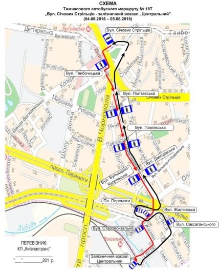 Автобусы маршрута № 18Т "Железнодорожный вокзал "Центральный" – ул. Сечевых Стрельцов" будут курсировать по маршруту: Вокзальная площадь – ул. С. Петлюры – ул. Саксаганского – ул. Старовокзальная – ул. Жилянская – ул. Бульварно-Кудрявская – площадь Победы – ул. Дмитровская – ул. Чорновила – Глыбочицкий проезд – ул. Глыбочицкая; в обратном направлении: ул. Сечевых Стрельцов – ул. В. Котарбинского – ул. Дмитровская – ул. Старовокзальная.