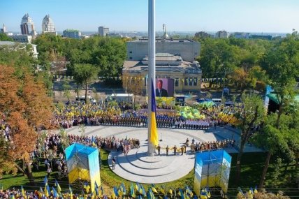 Под торжественные залпы в воздух и Гимн Украины желто-голубой стяг достиг вершины флагштока и возвысился над Днепром.