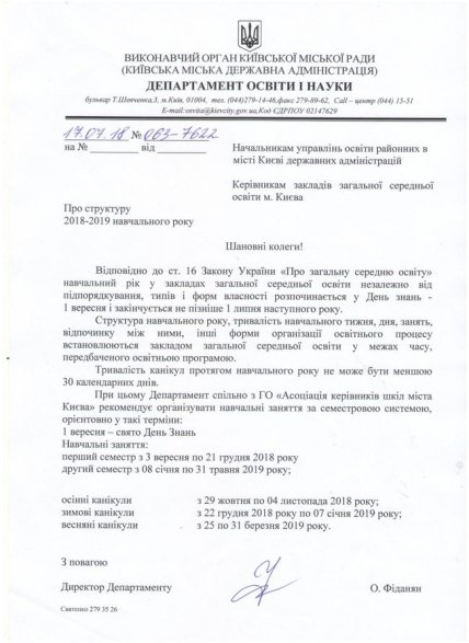 Учебный год традиционно стартует 1 сентября и завершается не позднее 1 июля 2019 года. Длительность каникул в течение года не может быть меньше 30 дней. Также департамент образования КГГА рекомендует столичным школам организовать учебный процесс по семестровой системе в два семестра, соответственно 3 сентября-21 декабря и 8 января-31 мая.