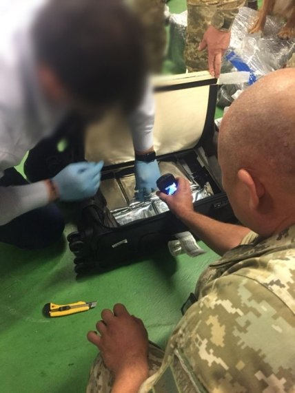 "Урожайный выдался день для пограничников, и абсолютно неудачный для наркокурьеров… Во время детального осмотра чемодана была обнаружена двойная стенка, где находилось 5 пакетов с белым веществом, похожим на кокаин, общим весом 5,4 кг", - написал в среду утром в своей странице в соцсети Фейсбук помощник главы Госпогранслужбы Украины Олег Слободян.