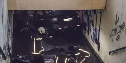 В Киеве на пересечении Воздухофлотского проспекта и улицы Огиенко водитель Mazda выехал на встречную полосу, снес остановку и влетел в подземный переход.