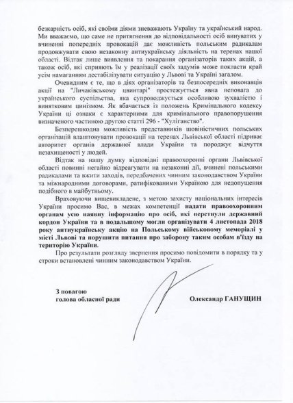 "Убежден, что хулиганским поступкам не место на украинских кладбищах. Надеюсь, что Национальная полиция Украины вместе со Службой безопасности, пограничниками быстро найдут хулиганов, которые жгли файеры на Лычакове неделю тому назад. А польская полиция проявит мудрость и поможет привлечь их к ответственности. И Министерство иностранных дел, считаю, имеет все основания объявить силезских хулиганов персонами non grata в Украине", - сказал Ганущин.