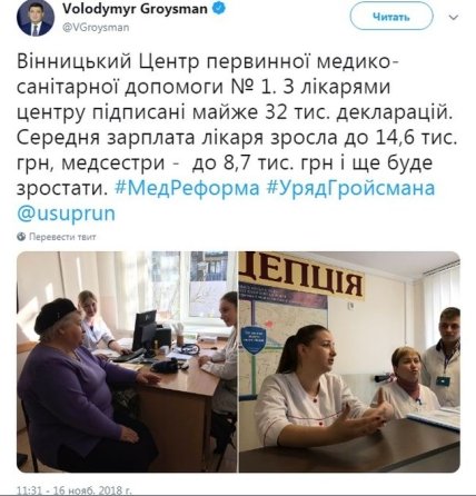 "Пообщался с врачами, услышал от них положительные отзывы о реформе. Особенно о росте зарплат. Это хорошая мотивация для нас продолжать изменения и для врачей - работать лучше", - заявил Гройсман.