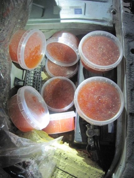 Госпогранслужба сообщила, что в ночь на 18 января на границе с Россией пограничники и сотрудники ГФС в пункте пропуска "Бачевск" в автомобиле Mercedes, принадлежавшему гражданину Молдовы 1959 года рождения во время осмотра обнаружили спрятанную от погранично-таможенного контроля партию красной икры.