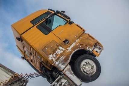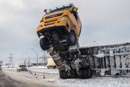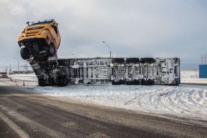 По словам водителя, его подбросило на выбоине, резко повело в сторону и перевернуло. Грузовик завис в нескольких метрах над встречной полосой. Спасатели смыли остатки бензина, который вытек из бака грузовика.