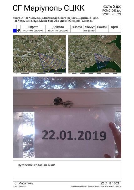 "В ходе проведения фотофиксации были отмечены повреждения здания функционирующего детского сада "Солнышко" по адресу ул.Мира, д.21а. В частности, с утра 22 января заведующая детским заведением обнаружила пулевое отверстие в оконной раме и внутренней стене игровой комнаты. Наблюдатели СЦКК выяснили, что повреждения были нанесены пулей калибра 7,62 мм, которую нашли на полу комнаты", - сказано в сообщении.