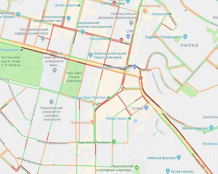Транспорт застрял в пробках на улицах Вадима Гетьмана, Жилянской, Большой Васильковской, Голосеевском проспекте, бульваре Леси Украинки в районе станции метро "Кловская". Осложнено движение по проспекту Валерия Лобановского в районе Севастопольской площади.