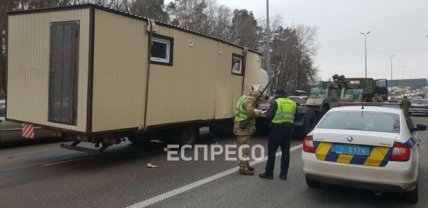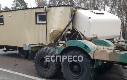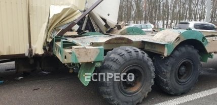 На выезде из Киева водитель грузовика врезался в платформу военного тягача и получил незначительные травмы.