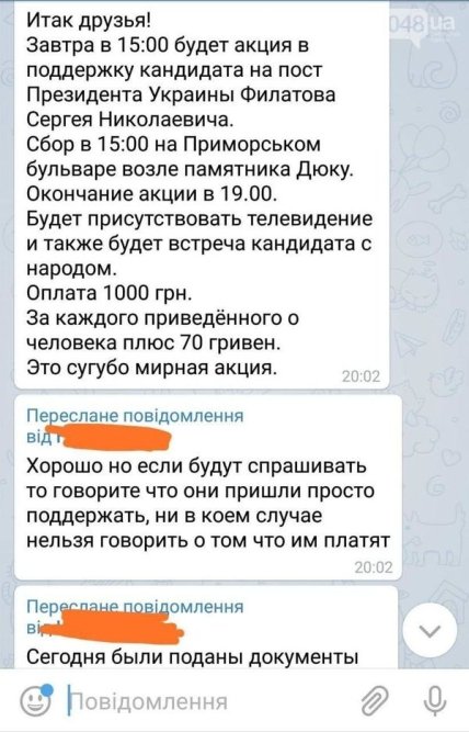 Несколько дней до этого в группах студентов в вайбере и на сайтах объявлений всем желающим предлагали "поработать" - постоять на митинге. В некоторых объявлениях сообщалось о поддержке некоего кандидата в президенты Сергея Филатова.