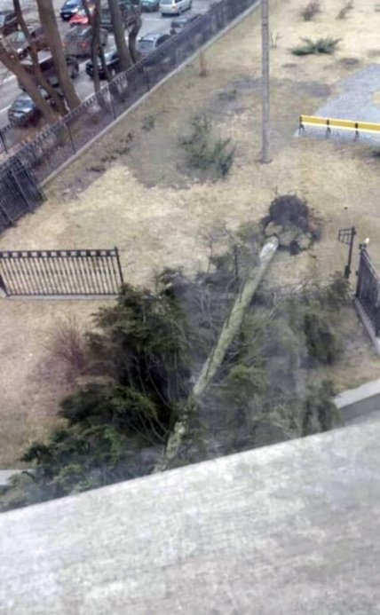 Как сообщают в социальных сетях очевидцы, высокая ель обрушилась возле здания парламента "под куполом" по улице Грушевского, 5, перекрыв один из въездов во внутренний двор, а также подход к одному из подъездов.