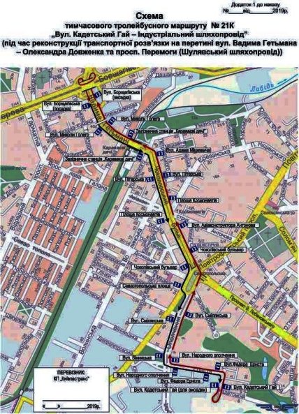 "Движение транспорта в направлении улиц Александра Довженко - Вадима Гетьмана будет происходить по улицам Антона Цедика и Петра Нестерова, с выездом на проспект Победы. Для этого на пересечении улицы Петра Нестерова и проспекта Победы устроен временный светофорный объект. Дальше - по проспекту Победы до пересечения с улицей Гарматной - на указанном перекрестке также устраивается временный светофорный объект для обеспечения возможности левого поворота на улицу Гарматную. Далее - по улице Гарматной и улице Выборгской обеспечивается выезд на улицу Вадима Гетьмана" – говорится в сообщении, на официальной странице патрульной полиции в соцсети Фейсбук в четверг.