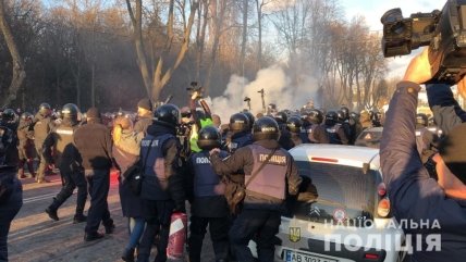 Колонна движется по улице Хмельницкое шоссе. Дорогу ей преградили правоохранители и автомобили спецподразделения патрульной полиции ТОР. Протестующие бросают в правоохранителей файеры. Перед этим они пытались войти в кордон полиции по тротуару, но их попыткам помешали правоохранители.