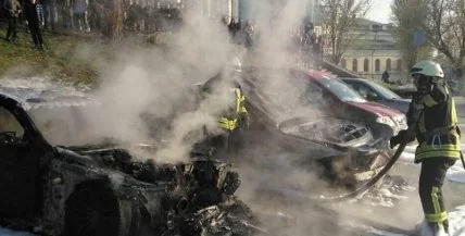 На парковке возле здания Национальной филармонии Украины неизвестный в балаклаве сжег два припаркованных автомобиля, сообщает пресс-служба Национальной полиции.