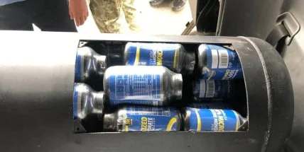 "Во время осмотра автомобиля сработала служебная собака пограничников, натренированная на поиск оружия и взрывчатки. В ходе дальнейшего осмотра, в газовом баллоне транспортного средства правоохранители обнаружили 56 банок с надписью "CREATINE", наполненных веществом, похожим на взрывчатку в виде пороха", - сообщает пресс-служба Госпогранслужбы Украины.