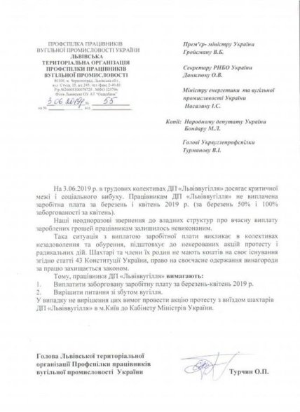 В обращении указывается, что по состоянию на 3 июня коллектив предприятия не получил половину заработной платы за март и в полном объеме зарплаты за май. После неоднократных обращений к представителям госструктур ничем не увенчались.