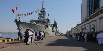У причалов морвокзала выстроилась линейка боевых кораблей, которую возглавляет фрегат "Гетман Сагайдачный", флагман группы кораблей НАТО в Средиземном море фрегат Toronto и эсминец Dunkan британских Королевских ВМС, а на берегу - образцы военной техники, артиллерийские установки и пушки.