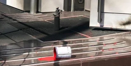 Установлено, что ночью неизвестные облили красной краской фасадную стену помещения и лестницу, а также повредили металлопластиковую дверь и разбили в ней стекло. У входа была обнаружена использованная дымовая шашка.