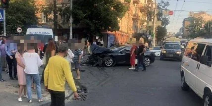 Как сообщает в понедельник отдел коммуникации полиции г.Киева, по предварительной информации, после столкновения на перекрестке автомобилей Range Rover и Tesla внедорожник отбросило на людей.