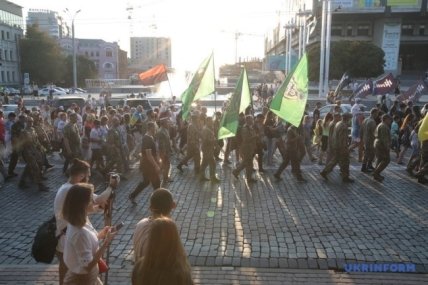 В 18:00 на площади Конституции у монумента Незавиисимости собралось до тысячи участников акции "Марш защитников" - участников АТО/ООС, представителей общественных организаций, волонтеров, обычных горожан. В руках у собравшихся - флаги Украины, красно-черные флаги, а также черные флаги организации "Фрайкор", флаги "Союза ветеранов АТО Харьковской области", в том числе, 92-й отдельной механизированной бригады.
