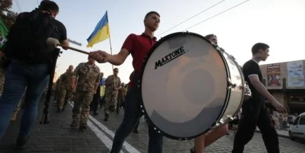 По команде организаторов участники выстроились в колонну - во главе два барабанщика и активисты "Фрайкора" в черной форме - и двинулись под барабанную дробь по главной Сумской улице к памятнику Шевченко. По пути они скандировали: "Слава Украине - героям слава!", "Слава нации - смерть врагам!", "Одна єдина соборна Україна!", "Нас багато, нас не подолати"...