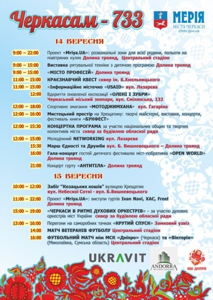 Жители Черкасс на выходные 14-15 сентября отмечают 733 годовщину со дня основания, в городе пройдут массовые мероприятия.