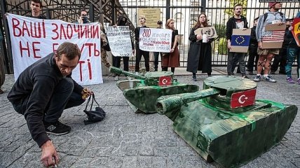 Возле диппредставительства протестующие также установили два картонных макета танка, символизирующие военную операцию Турции в Сирии.