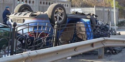 Там рассказали, что водитель машины не справился с управлением, выехал на тротуар и сбил 14 метров отбойника и 20 метров пешеходного ограждения, фрагмент которого от удара улетел на территорию производственной базы КП ДЭУ Печерского района.