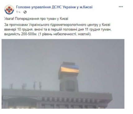 "До конца суток 11 декабря, ночью и утром 12 декабря в Киеве сохранится туман, видимость 200-500 м (І уровень опасности, желтый)", – говорится в обнародованном Гидрометцентром в ночь на четверг сообщении.