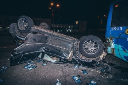 В ночь на 12 января в Киеве на проспекте Степана Бандеры недалеко от железнодорожной станции "Зенит" произошло ДТП с участием двух автомобилей и троллейбуса. В результате столкновения Mercedes перевернулся.