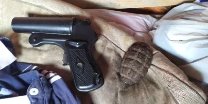 Во время обыска обнаружено и изъято корпус гранаты Ф1, металлический предмет внешне похожий на противотанковую мину из взрывателя и сигнальный пистолет (ракетница).