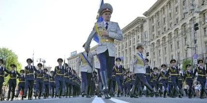 Они приветствовали участников военного парада по случаю Дня Победы - военнослужащих, курсантов и членов киевского клуба "Красная звезда", традиционно участвующих в торжествах 9 мая в форме солдат и офицеров времен Великой Отечественной войны.