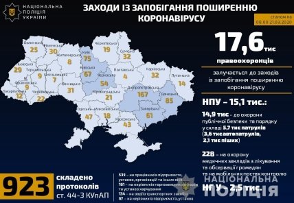 "Сегодня полицейские составили 923 административных протокола по ст. 44-3 (Нарушение правил карантина людей) КоАП. Больше всего нарушений выявлено в Днепропетровской области - 167, в Донецкой - 85, в городе Киеве – 75", - говорится в сообщении.