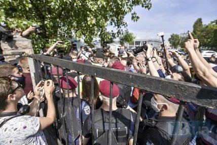 Так, люди под судом зажгли файеры и громко выкрикивали лозунги с требованием отпустить активиста. Также произошли потасовка и столкновения.