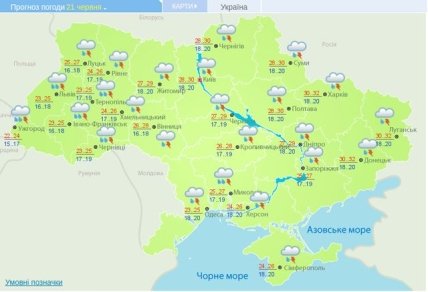 "21 июня переменная облачность. Кратковременные дожди (ночью местами), грозы; в Карпатском регионе, днем местами в южных областях значительные дожди. Ветер переменных направлений, 3-8 м/с, днем в отдельных районах град и шквалы 15-20 м/с", - говорится в сообщении.