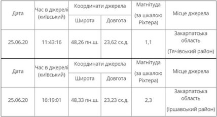 В четверг, 25 июня, в Закарпатской области произошло два землетрясения.